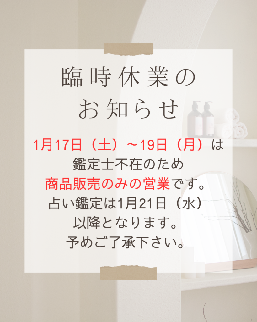 また1月20日(火)は定休日のため、占い鑑定は1月21日(水)より通常営業となります。