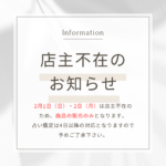 今週末17日(土)~19日(月)は鑑定士不在のため、占い鑑定は休業いたします。 開運お守りパワーストーンジュエリーの販売と、パワーストーンブレスレットのゴム交換お預かりのみの対応となります。 また1月20日(火)は定休日 […]